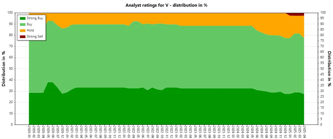 Analyst sentiment regarding Visa Inc. shows cautious optimism. While the company retains significant "Buy" and "Strong Buy" ratings, the slight increase in "Hold" ratings indicates a possible shift towards more balanced perspectives. The data implies confidence in Visa's strategic positioning, yet there is an undercurrent of prudence suggesting some analysts may be hedging against market volatility.
